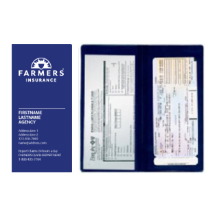 Proof of insurance policy holder folds open and features two clear pockets inside. Farmers logo and up to 4 lines of custom imprint. Size: 9 1/2 x 4 1/2. Minimum order is 5 packs of 50. Additional quantities must be ordered in packs of 50.
