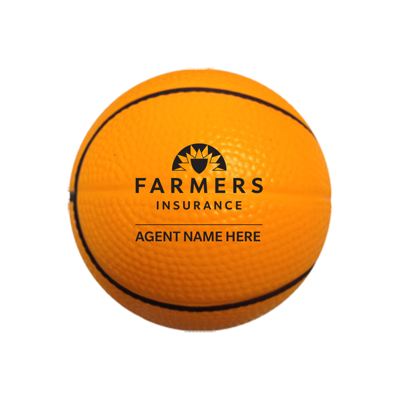 Basketball shape stress reliever. Foam stress relievers are a fun & inexpensive way to advertise. Product size: 2½" diameter. Farmers logo with your agency name printed in black on one side.