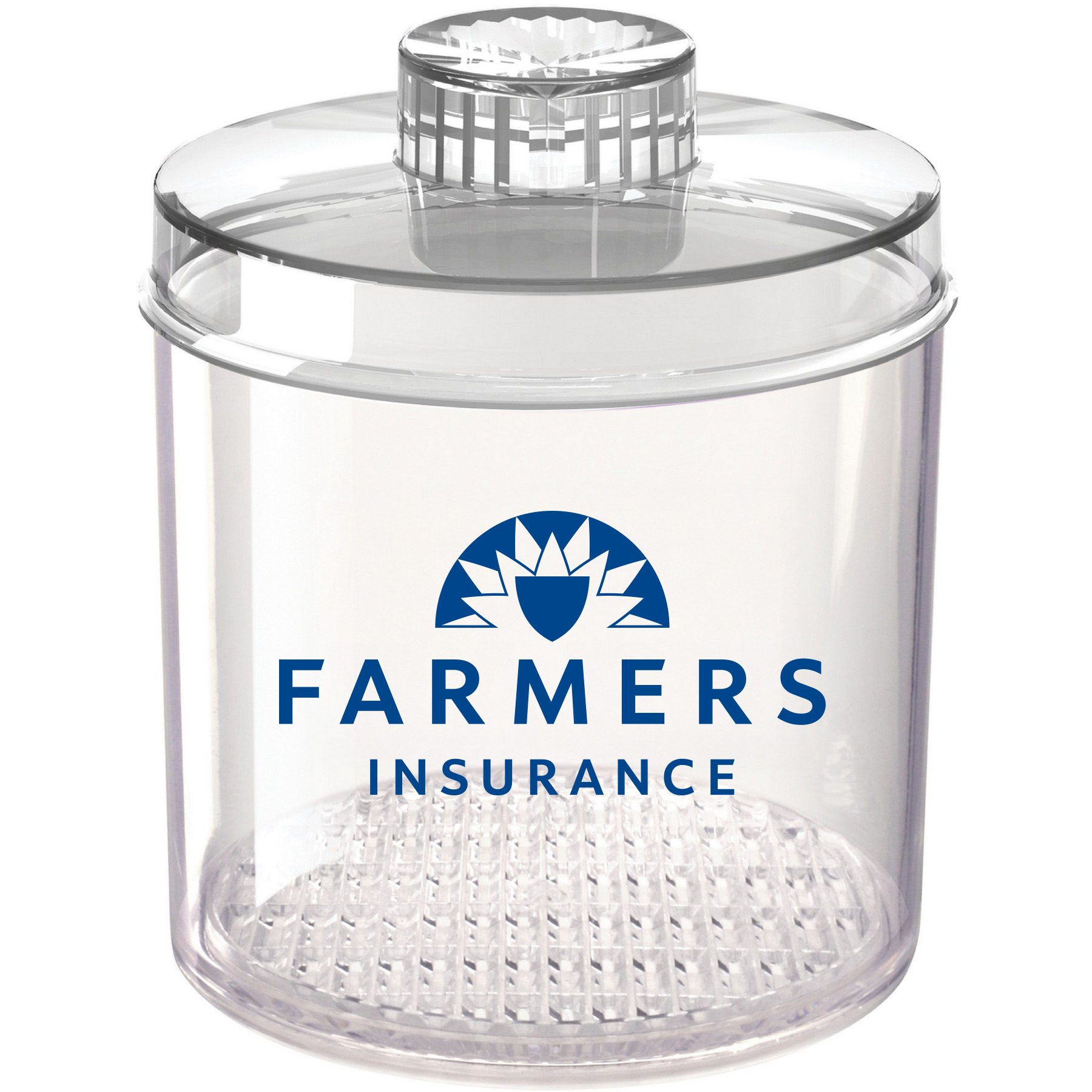 14 oz Acrylic candy jar with clear lid and blue Farmers logo. Made in the USA.