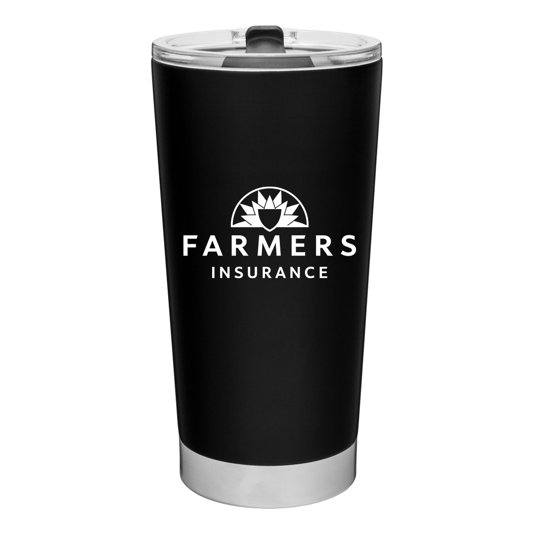 Matte black 20 oz double wall 18/8 stainless steel thermal tumbler with vacuum insulation, and clear acrylic push-on swivel lid. Gift box included. The Farmers logo is imprinted in white.