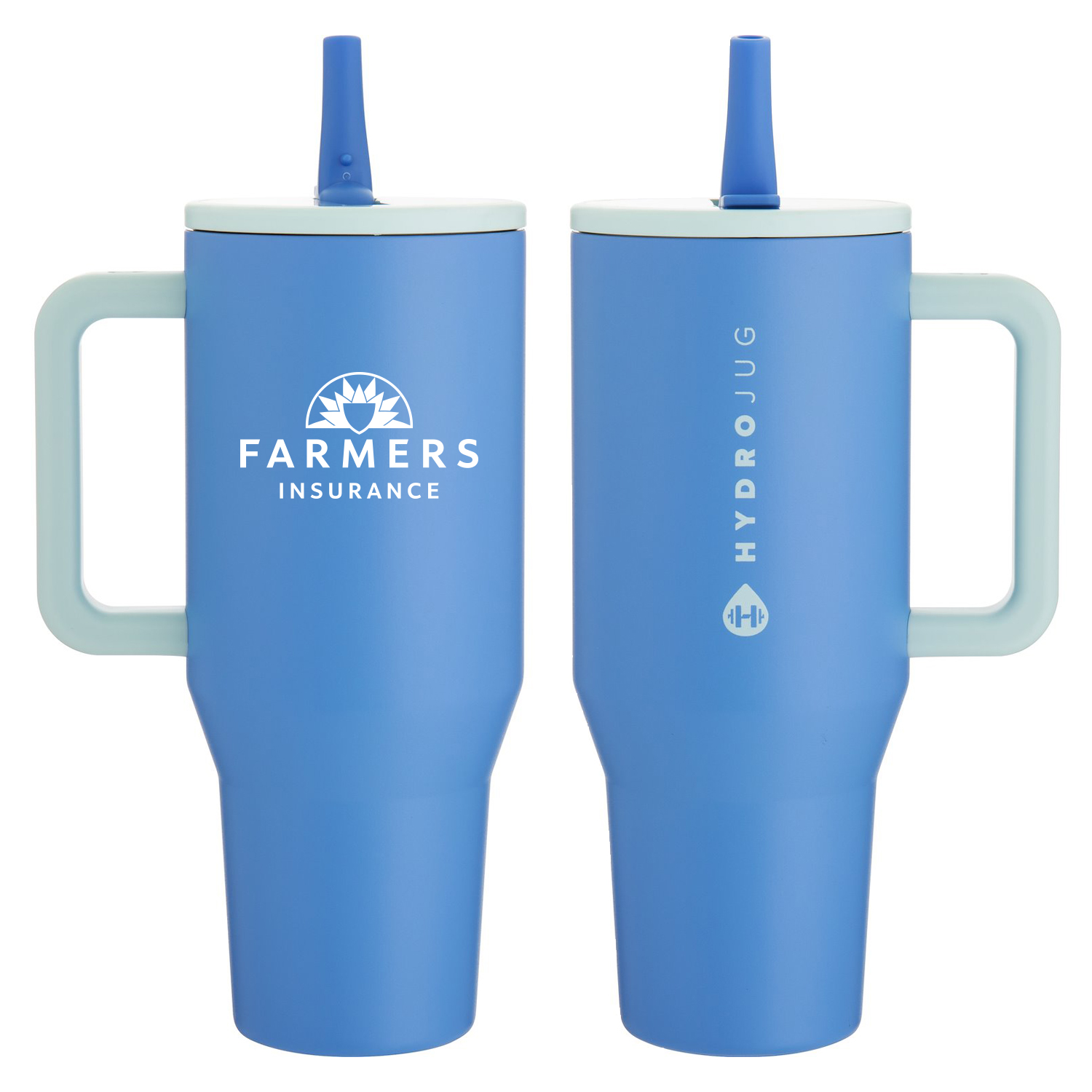 40 oz double wall 18/8 stainless steel thermal mug with copper vacuum insulation, ambidextrous threaded lid, matching flip-up spout, straw, wide handle, and powder coated finish.