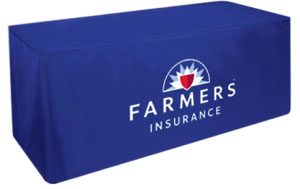 6' blue fitted table throw. Tailored lines create a polished appearance at any meeting, show or career fair. This table throw covers 4 sides of the table. It has a tight/fitted look. Flame retardant, premium polyester poplin fabric. Machine washable and wrinkle resistant. Please do not dry clean and do not iron. Full color Farmers logo printed on the front panel. Product size: 72"W x 30"D x 29"H