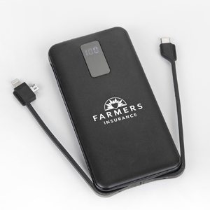 No cables? No problem! This 10,000 mAh power bank comes with multiple built in cables capable of charging any modern phone at the fastest speeds! Designed with an easy grip material and LED digital display to make this the most user friendly power bank on the market! Capacity: 10,000 mAh Inputs: Micro USB, Type C Farmers logo is imprinted in white.