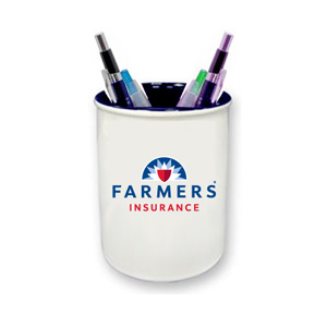 White ceramic pen caddy with full color Farmers logo.