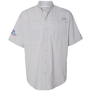 Light Grey Columbia Short Sleeve Button Down. 100% polyester with mesh lined vent at center back. UPS 40 and moisture wicking properties. Chest pocket with snap closure. Farmers logo embroidered on right sleeve.