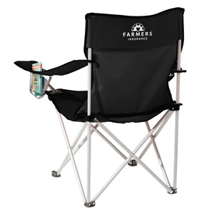 Black PolyCanvas outdoor chair folds up and fits into carrying case with strap for easy transporting and storage. Features armrests with built-in cup holders. Some assembly required. The Farmers logo is printed in white on the back of chair so when seated the logo is still visible.