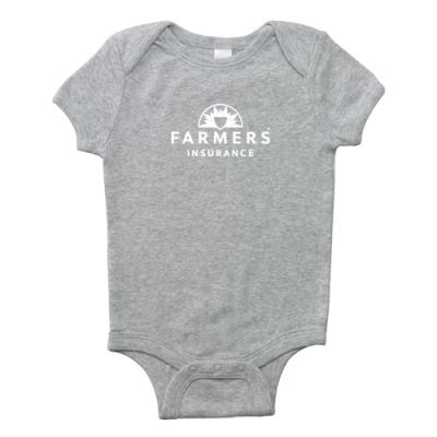 This one-piece for infants is made of 90% ringspun cotton and 10% polyester. It is very soft and cozy making it easy on sensitive skin. The heather grey color makes this perfect for both baby boys and girls. The Farmers logo is imprinted in white on the front chest.