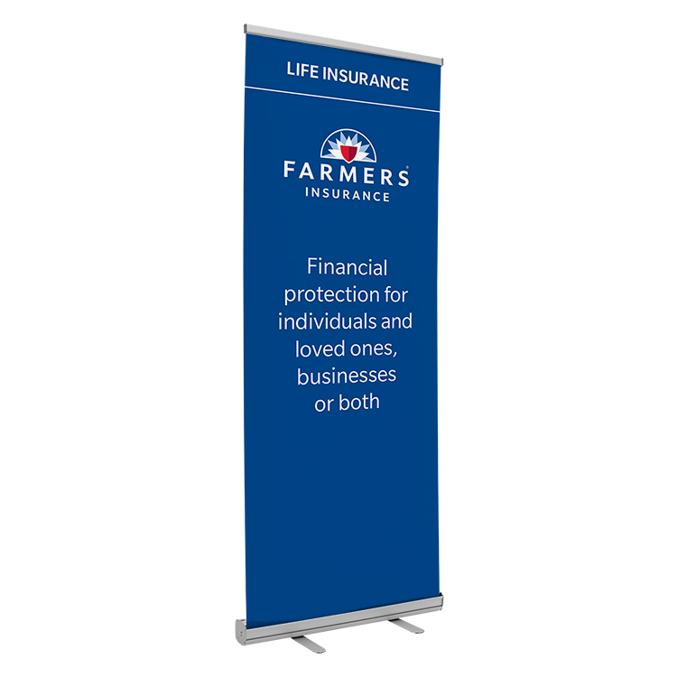 Retractor display for events with Farmers Life Insurance graphics in ENGLISH.