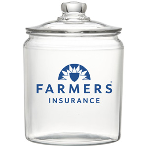 Half gallon glass candy jar with glass lid. Farmers logo imprinted in blue on front.