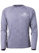 Men's long sleeve wicking shirt available in heather grey and royal blue. Made of stretchy and comfortable 90% polyester and 10% spandex fabric. Decorative and functional reflective patterns on front & back with the Farmers logo in white on the front left chest. Moisture wicking management with and UPF 30 rating. Perfect for working out in or wearing around town!