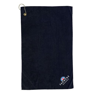 Blue 16" x 25", 3.5lb./doz., terry velour, 100% cotton towel. Dobby hemmed heavyweight golf towel. Includes corner grommet and hook. Farmers logo embroidered in bottom corner.
