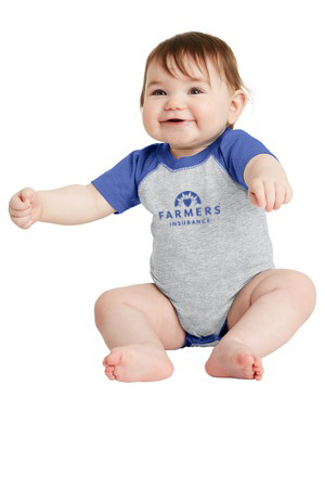 This baseball-style bodysuit will have your baby cheering for the home team. Raglan sleeves and contrast ribbed leg openings give this bodysuit an all-star look. 4.5-ounce, 100% combed ring spun cotton fine jersey. Flatlock stitch ribbed collar and raglan armholes. EasyTear label for additional comfort and ability to brand as your own. Double-needle sleeves, Double-needle ribbed binding on leg openings. Reinforced three-snap closure. Available in pink or blue with the Farmers logo on the front in blue.