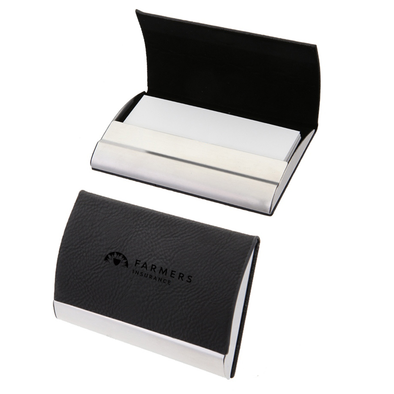 Deliver business cards or protect your credit cards in style with our leatherette stainless steel card holder! Farmers logo laser engraved.