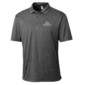 100% Polyester, Active short sleeve polo, Polyester single jersey, Collar, Three button placket, Self fabric neck trim, Side vents at bottom hem. Black heather material with the Farmers logo embroidered on the left chest.