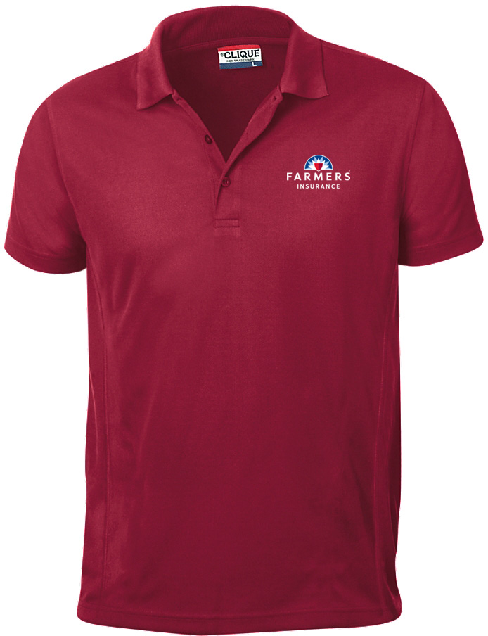 This 100% Polyester polo features; a rib knit collar, forward shoulder, open sleeves, three-button placket, back half-moon, fully taped neck seam. Available in white, black, maroon, and royal blue with the full color Farmers logo on the left chest.