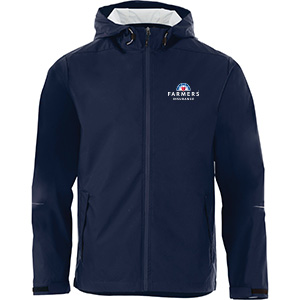 Classic waterproof rain jacket with full seam sealing and waterproof zipper. Adjustable cuff tabs with hook and loop closure. Heat transfer reflective details. Cinch hood, polyester twill woven. Farmers logo heat transfer on left chest.