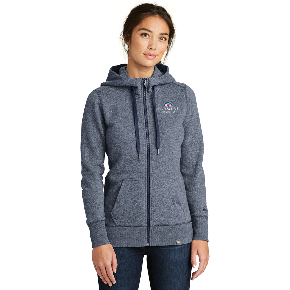 This hoodie fuses the soft feel of an old-school essential with modern must-have details. Made of 9.4-ounce, 52/48 cotton/poly sueded French terry with coverstitched seams. Lined and twill-taped 3-panel hood, zip-through collar, rolled-forward shoulders, rib knit side panels, front pouch pockets, and rib knit cuffs and hem. Woven New Era patch label at hem with embroidered New Era flag logo on left sleeve. Farmers Insurance logo embroidered on the left chest.