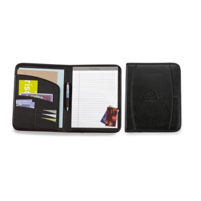 Black faux leather padfolio. Debossed with Farmers new logo on cover. Sleek and modern, this writing pad offers interior storage for all your essentials. Molded pen holder (pen not included) and includes 8.5" x 11" paper pad; accommodates an A4 Pad. Slash pocket fits most tablets.
