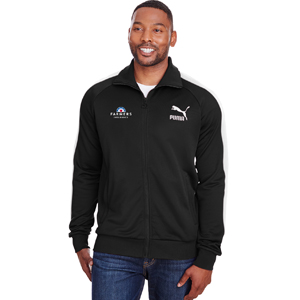 Retro inspired Puma track jacket. 59% polyester and 41% cotton terry. Full-zip closure with stand-up collar. Front pockets for closure. Ribbed cuffs and hem. Puma logo on left chest, Farmers logo embroidered on the right chest.