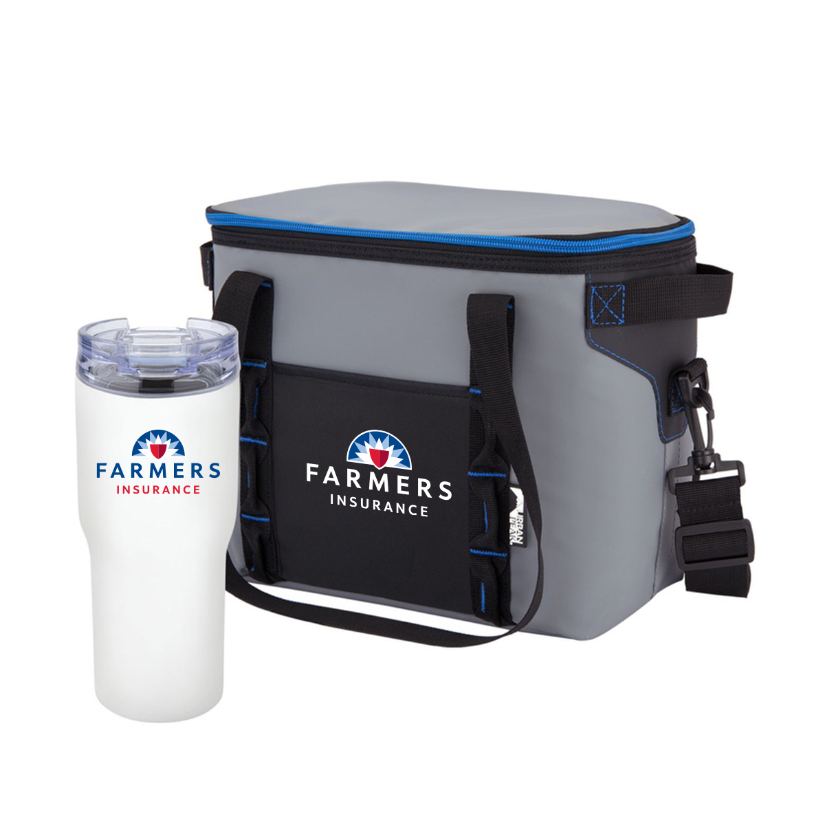 Pack up for the day with this Cooler and Tumbler duo. Urban Peak Waterproof 12 can hinge cooler can house all your food and drinks for the beach, game day, or picnic. Cooler bag is made of rugged waterproof 55C PVC Mesh Tarpaulin. 20 oz. Vacuum Tumbler is constructed of Stainless Steel, double wall copper-lined vacuum insulation with powder-coat finish. Farmers logo imprinted in full color on each item. Tumbler comes packaged inside