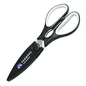 Stainless steel construction with serrated edge blades. Jar lid opener/gripper. Magnetic plastic blade sheath for hanging on refrigerator, filing cabinet, or any other metal surface! The Farmers logo is imprinted in full color on the sheath.
