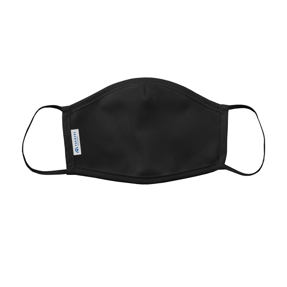 PREORDER NOW FOR ARRIVAL LATE JUNE Protect yourself and others with this personal face mask. These help free up the supply of N95 masks for essential personnel that need them. Made from tight knit double-walled fabric. These are washable and reusable. Covers your face, mouth and nose to reduce the spread of germs and keeps you from touching your face. Straps wrap around each ear. 2-ply polyester material. Sold in packs of 5. Note: this item is not medical grade and is not a substitute for N95 and other medical grade masks. Black mask featuring a woven label with the blue Farmers logo.